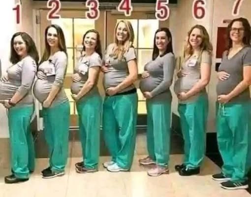 The Correct Answer: Woman Number 7 (Far Right) Is NOT Pregnant