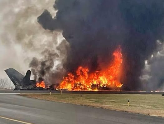 Aerial view of an airport crash site with large flames and thick black smoke.